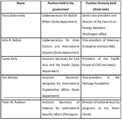 This practice is liberally applied by many governments who have appointed researchers/experts for governmental positions. Additionally, retiring government officials enjoy opportunities of employment in renowned think tanks. The ‘revolving door’ clearly blurs the distinction between government official and external analysts. For example, the previous Bush administration gave several positions to experts in foreign policy affairs. Following is a list of the officials.