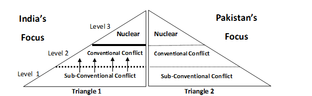 Pakistan’s asymmetry with the Indian military was a pressing issue for its decision-makers. To address the conventional gap, Islamabad chose to take the sub-conventional route by employing state-funded non-state actors and bleeding India by a thousand cuts. It is worth noting that sub-conventional activities (terrorism) in Kashmir were initiated and carried out by Pakistan-based and supported terror groups against the nuclear backdrop. To understand this better, let us look at the figure below with Triangle 1 (which denotes India’s focus) and Triangle 2 (which denotes Pakistan’s focus). The Triangles are divided into Sub-conventional (Level 1), Conventional (Level 2) and Nuclear (Level 3) Conflicts.
